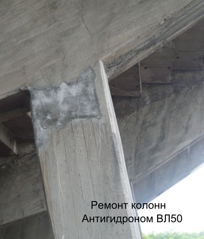 Для ремонта, омоноличивания, гидроизоляции и защиты бетонных изделий и конструкций используется Антигидрон марки ВЛ50 «Ремонтно–гидроизолирующий» . На фото ниже приведен пример ремонт железобетонных колонн. Посмотреть этапы ремонта бетона с помощью "Антигидрона" марки ВЛ50 можно здесь. ![]()